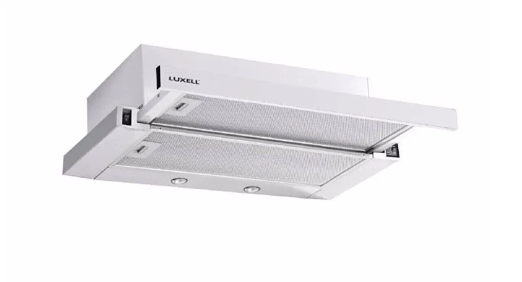 Вытяжка телескопическая LUXELL DS6-905 белого цвета — встраиваемая модель, предназначенная для очистки воздуха от запахов, паров и загрязнений в кухне.