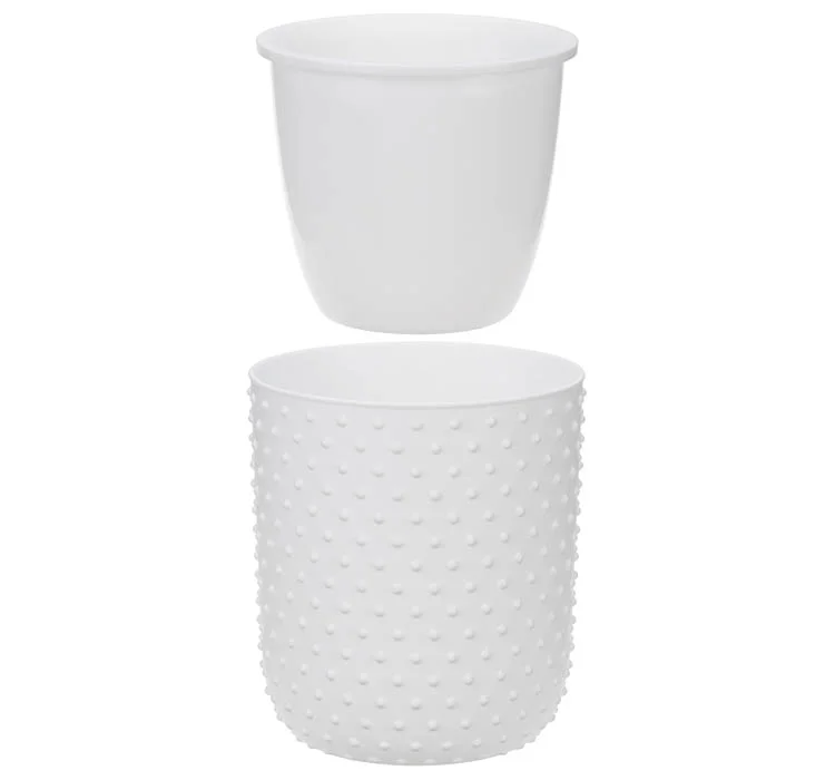 Особый характер кашпо придают выпуклые точки, расположенные в шахматном порядке. Эти «пузырьки» создают объемный 3D–эффект, играя со светом и тенями.