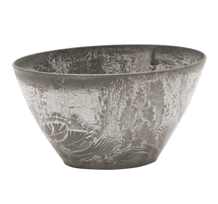Кашпо отличается элегантной овальной формой, напоминающей гладкий речной камень. Его текстура, имитирующая горную породу, устойчива к солнечным лучам и перепадам температур.
