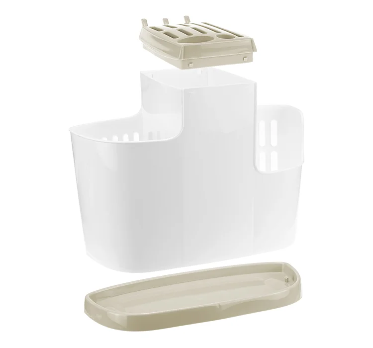 Органайзер позволяет компактно разложить кухонные приборы и аксессуары для сушки. Имеет два отделения разной высоты для столовых приборов, отверстия для сушки ножей, лопаток, поварёшек, а также крючки для сушки ситечка, ножа для овощей и другой кухонной утвари. Поддон и крышка закреплены на защёлки, но легко снимаются для мытья. Прочный, практичный и вместительный аксессуар для кухни прослужит хозяйке многие годы.