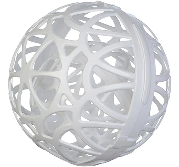 Изделие состоит из двух сфер.Перед стиркой чашки бюстгалтера нужно разместить вокруг малой сферы, заправить в нее бретельки, а сверху закрыть большой сферой. После этого сферу смело можно класть в барабан стиральной машины, вместе с другим бельем.