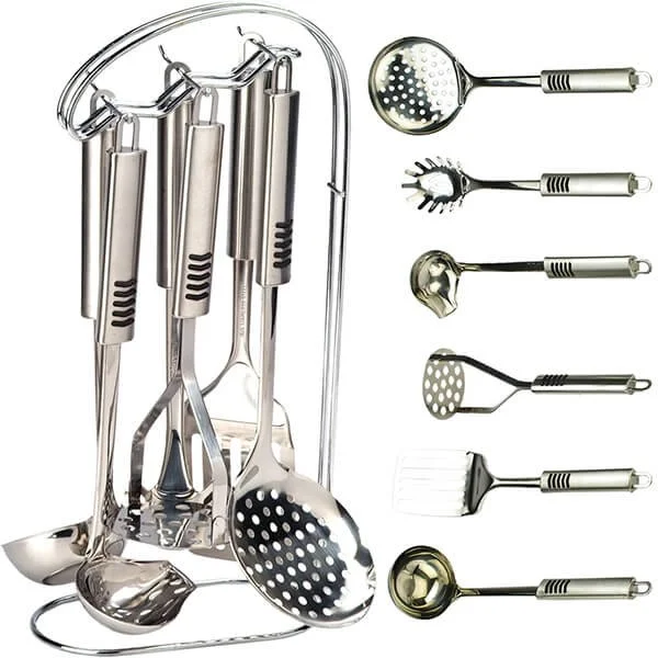 - Набор состоит из: лопатка, картофелемялка, половник, шумовка, подставка, ложка для спагетти, соусник