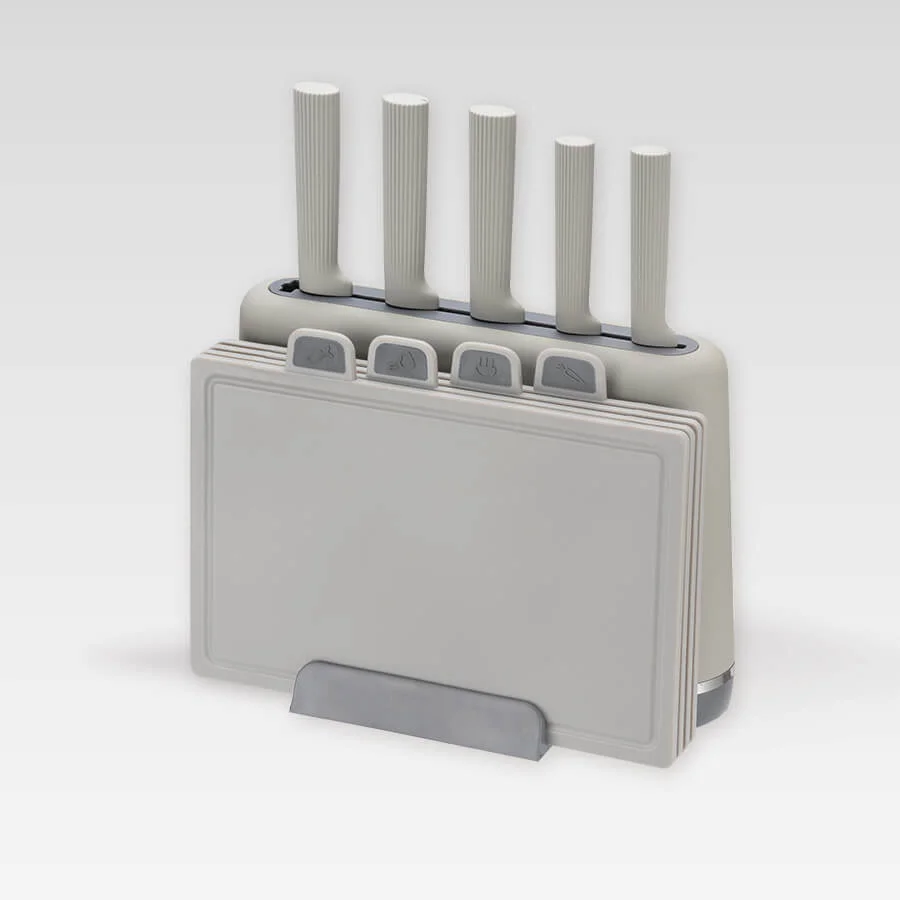 - Набор состоит из комплекта 5-ти ножей + комплекта 4-х разделочных досок в подставке