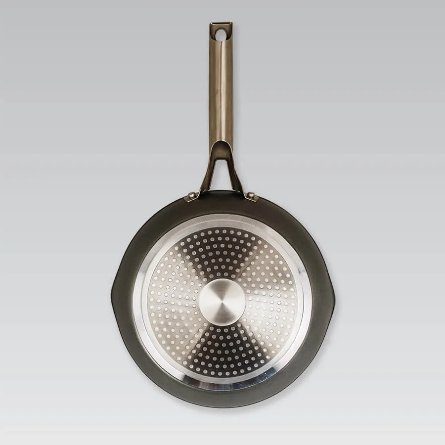 - Cковорода имеет интегрированную систему дозировки масла (круговая разметка дна), что способствует равномерной прожарке, ускоряет приготовление, улучшает антипригарные свойства.
