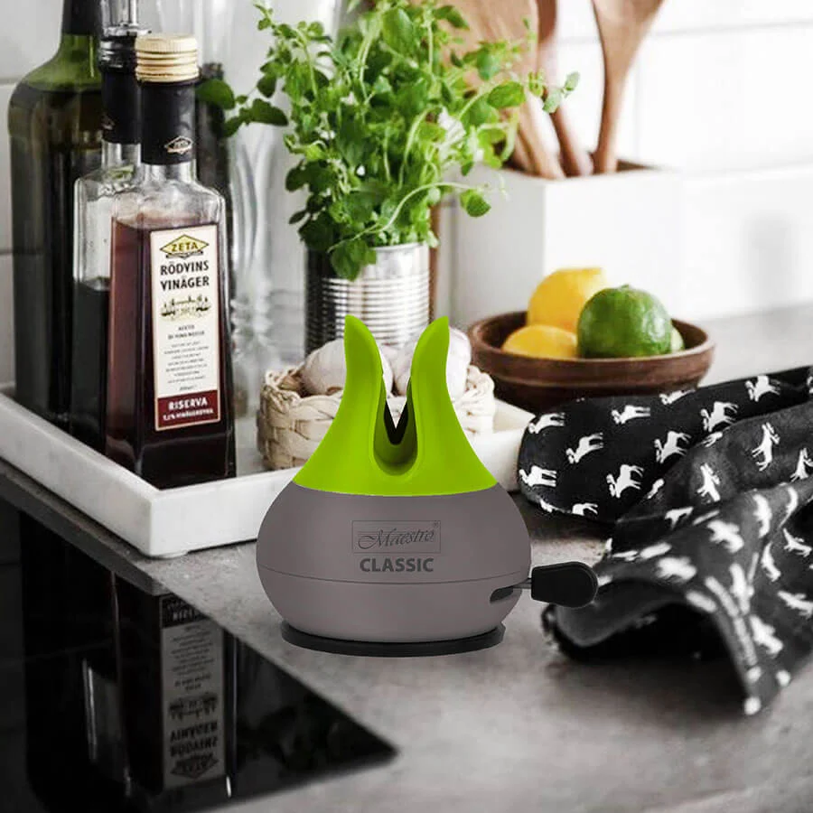 - Благодаря не скользящей, резиновой и удобной рукоятке, это точилка для кухонных ножей очень удобная и безопасная