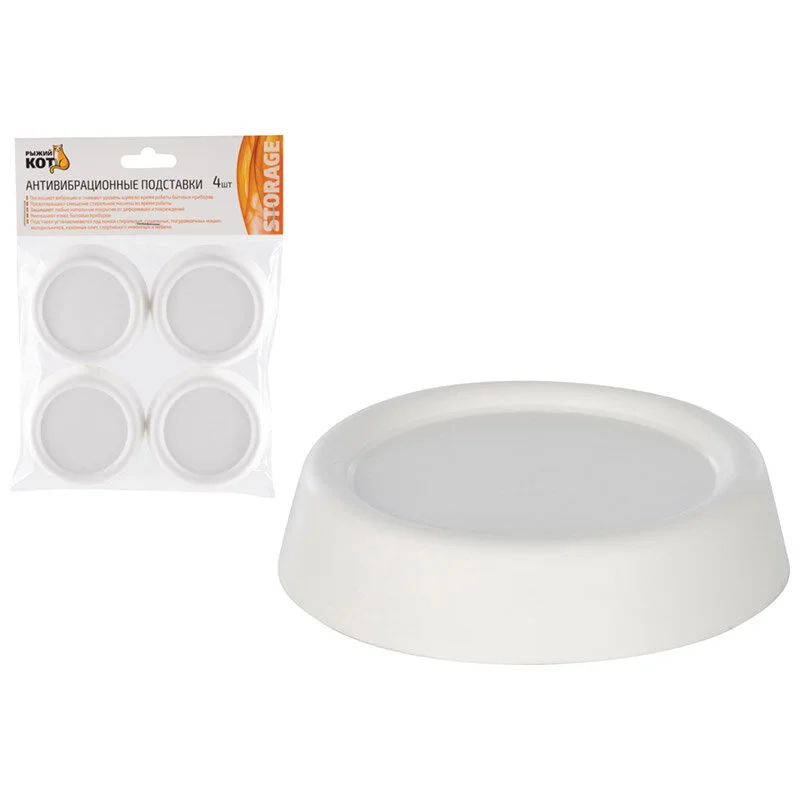 Белые круглые антивибрационные подставки. Материал:ТЭП. Толщина 15мм, диаметр одной подставки 63мм. - Поглощают вибрацию и снижают уровень шума во время работы бытовых приборов; - Предотвращают смещение стиральной машины во время работы; - Защищают любые напольные покрытия от деформаций и повреждений; - Уменьшают износ бытовых приборов; - Подставки устанавливаются под ножки стиральных, сушильных, посудомоечных машин, холодильников, кухонных плит, спортивного инвентаря и мебели.