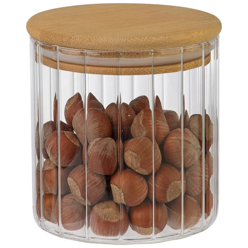Банка из рельефного стекла, AROMA RIVIERA, объём: 600 мл, с крышкой из бамбука. Назначение: для хранения сыпучих продуктов. Материал: боросиликатное стекло, бамбук, силикон. 600 мл, 10*10 см. Цветная коробка+пуз пленка.