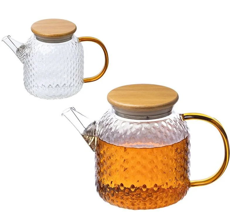Чайник заварочный AROMA, объем 1 л, из боросиликатного стекла с рельефом, с крышкой из бамбука и ручкой из окрашенного стекла. Материал: высококачественное боросиликатное стекло, фильтр из 304 стали, крышка - бамбук/силикон/нерж сталь. Объем 1 л. Упаковка: цветная коробка/пузырчатая пленка. Коэффициент линейного расширения - 3.