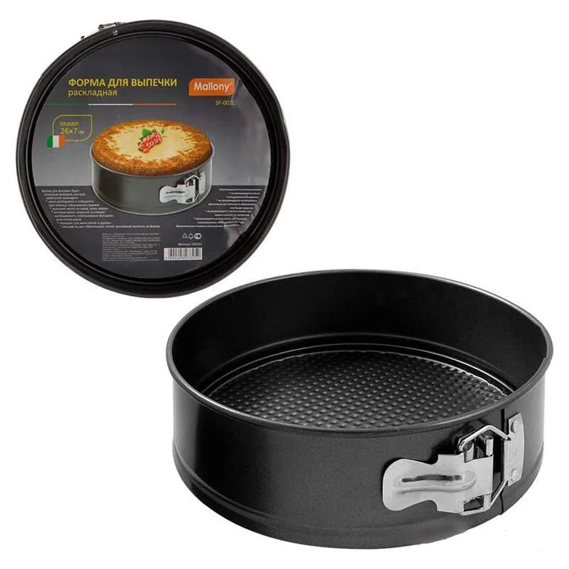 Размер: 22*6,8 см Толщина стали - 0,35 мм Вес: 260 гр Цвет - серый Материал: углеродистая сталь с антипригарным покрытием Круглая форма для выпечки будет отличным выбором для всех любителей домашней выпечки. * легко разбирается и собирается при помощи специального зажима * экономит место на кухне * легко моется * антипригарное покрытие исключает необходимость использования большого количества масла * подходит для мини печей и духовок * рельефное дно обеспечивает легкое вынимание выпечки из формы Упаковка: Цветной вкладыш и термоусадочная пленка.