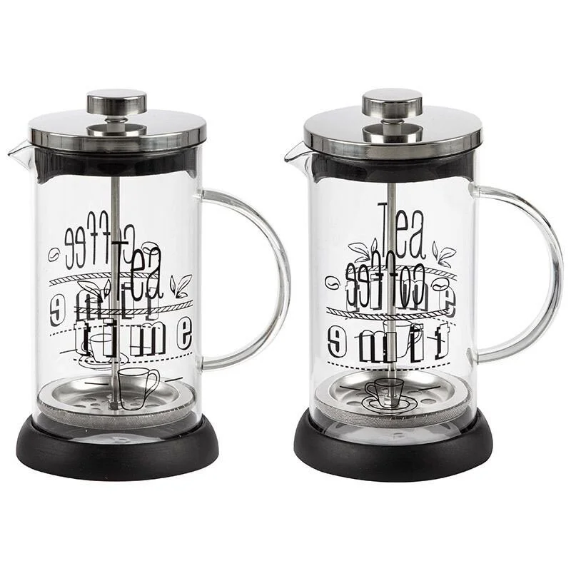 Френч пресс с надписью чай-кофе на стекле создает дизайнерский стиль и может подойти в кафе для оформления в интерьера в общем стиле.