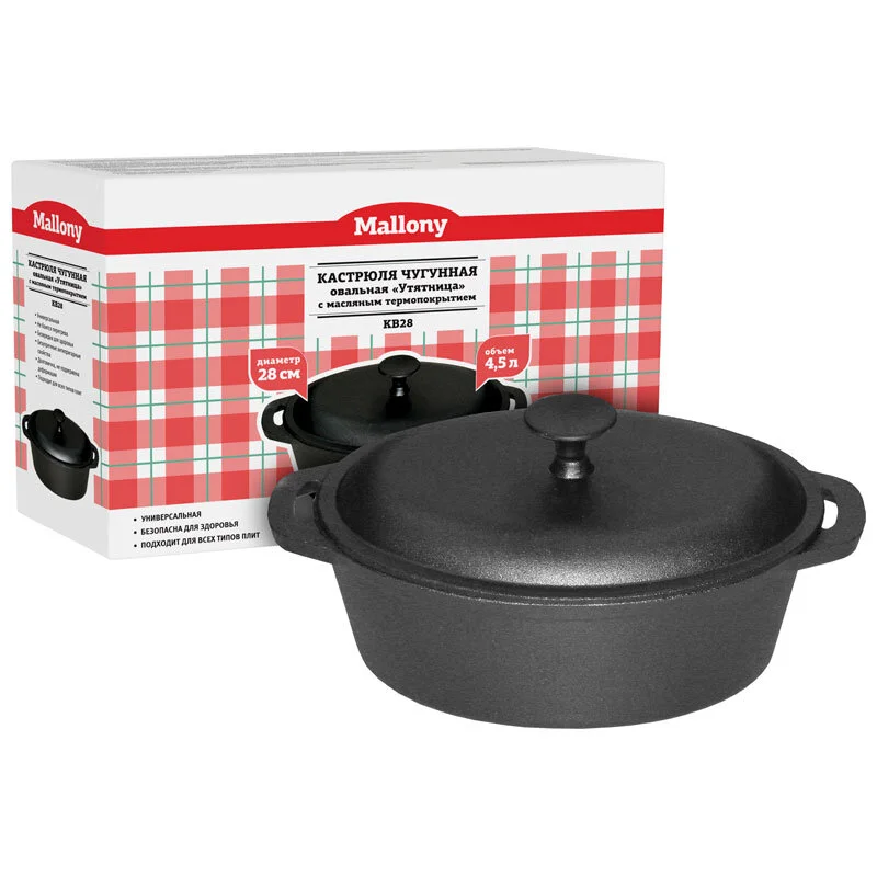 Кастрюля чугунная овальная KВ28 "Утятница", объем 3,9 л, с масляным термопокрытием Размер: 35*21*16,5 см Вес: 5 кг. Толщина стенок - 4,76 мм Материал: чугун. Подходит для всех типов плит. Упаковка: картонная коробка Безопасна для здоровья. Безупречные антипригарные свойства Нельзя мыть в посудомоечной машине. Правила по уходу указаны на упаковке товара.