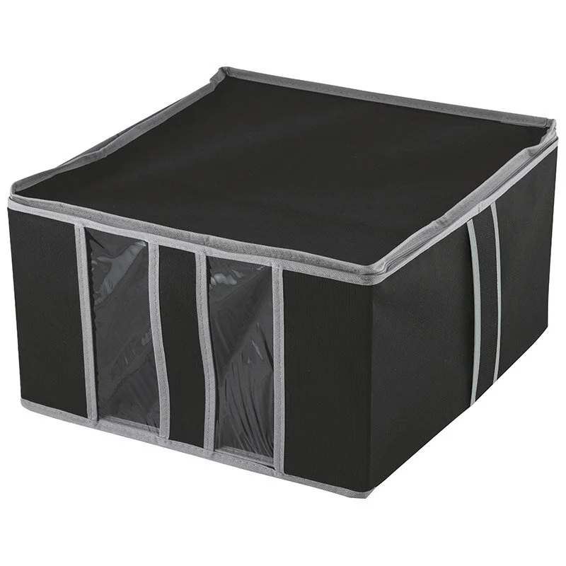 Материал/состав: спанбонд, плотность 70гр/квм, пленка ПВХ, двустор молния; Размер: 60х50х35см; Индивидуальная упаковка: п/э пакет с европодвесом и цветным вкладышем; Цвет: черный с серым кантом; Идеально подойдет для глубокого шкафа. Предохраняет Ваши вещи от загрязнения и преждевременного старения. Закрывается крышкой на двустор молнии, 2 удобные ручки, окошко ПВХ в передней стенке.