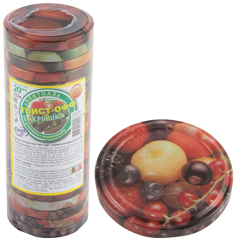 Материал/состав: жесть ЭЖК с классом покрытия олово, ПВХ Толщина жести: 0,18 мм Диаметр крышки: 66 мм В наборе: 20 шт. Покрытие крышек: литография (рисунок + лак) Индивидуальная упаковка: термоусадочная пленка Крышка Твист-ОФФ — представляет собой штампованное металлическое укупорочное средство с упорами для завинчивания, изготовленное из лакированной пищевыми консервными лаками и эмалями белой жести с внутренним уплотнением из материала на основе ПВХ. Каждая крышка изготовлена из надёжной белой жести. Покрыта безопасными пищевыми лаками. На её внешнюю сторону нанесена полноцветная литография, которая поможет отсортировать ваши заготовки и украсит любую кухню.