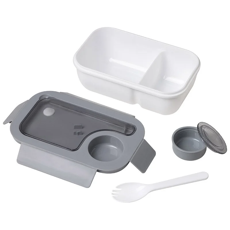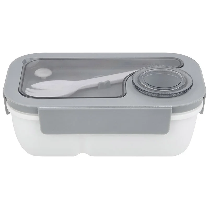 Ланч-бокс с отделениями – специальный контейнер для обеда, который удобно брать с собой на работу, в школу или в поездку. Внутри контейнер разделен на два отделения, что позволяет использовать его для двух разных блюд одновременно. Закрывается при помощи плотной крышки, в которой размещены многоразовая ложка-вилка и дополнительный контейнер для соуса. Можно греть в микроволновой печи, использовать для заморозки. Можно мыть в посудомоечной машине. Не рекомендуется использовать для первых блюд. Объем: 850 мл Размер: 19,5*12*7,8 см Вес: 220 гр Материал: полипропилен, элементы из силикона