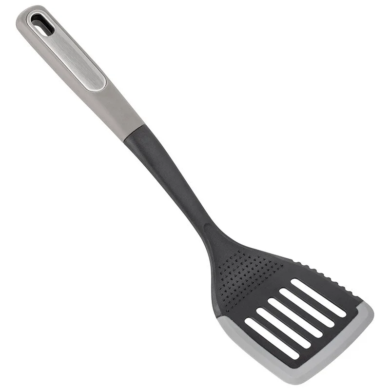 Лопатка с отверстиями CHEF из нейлона с силиконовым краем Материал: нейлон, силикон, полипропилен (ручка). Силиконовый край - защита посуды от царапин. *Край модели рифленый - предназначен для нарезки приготовленного мяса/стейков; рабочая часть дополнена тёркой для чеснока/имбиря, прочего. Картонная подложка + пакет.