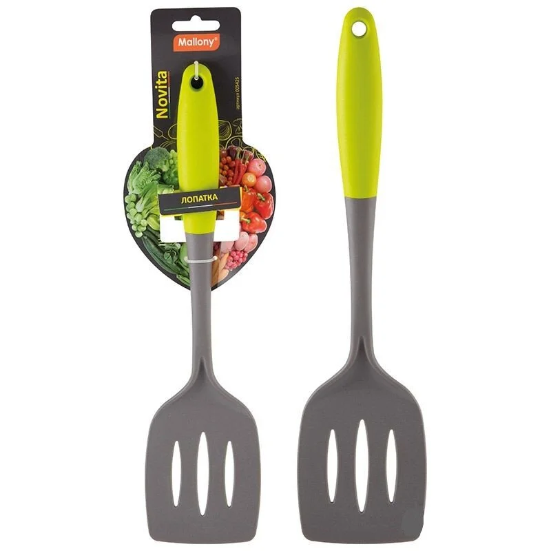 Лопатка с отверстиями из нейлона с цветной ручкой из TPR, серия Novita, тм Mallony Цвет ручки - зеленый, цвет рабочей части - серый. Материалы: нейлон, TPR Размер: 34*8,5*3,6 см Упаковка: цветная подложка. Предназначена для переворачивания/перемешивания блюд в процессе приготовления.