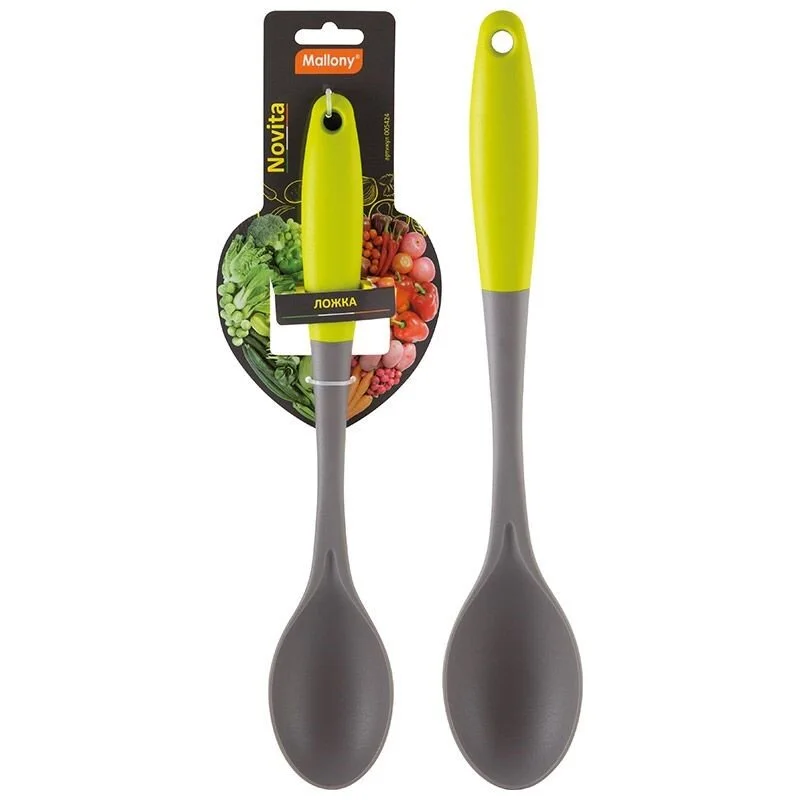 Ложка из нейлона с цветной ручкой из TPR, серия Novita, тм Mallony Цвет ручки - зеленый, цвет рабочей части - серый. Материалы: нейлон, TPR Размер: 33,3 * 6,3*3 см Упаковка: цветная подложка. Предназначена для помешивания блюд во время приготовления.