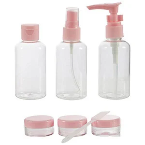 В наборе: 1 спрей флакон (75 мл), 1 флакон (75 мл), 1 диспенсер с предохранителем от случайного нажатия (75 мл), 3 баночки (по 10 мл), косметичка с зиппаром. Упаковка: цветной вкладыш Удобные и практичные емкости под косметические средства. Набор состоит из самых необходимых предметов. Емкости многоразовые и легко моются. Набор упакован в косметичку с пластиковым зиппером. Разрешено для ручной клади при авиаперелетах