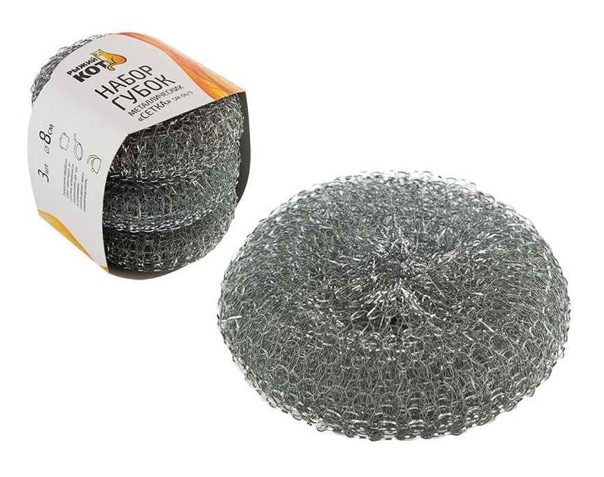 Набор губок металлических, сетка Размер изделия без упаковки: 8*8*3 см. материал: нержавеющая сталь Набор: 3 шт. Упаковка: цветной рукав Металлическая мочалка эффективно очищает сильно загрязненные поверхности и удаляет жир. Мочалка идеально подходит для чистки раковин и плит, сковородок и кастрюль, грилей, решеток и других инструментов для жарки. Специальная обработка краев спирали у мочалки, гарантирует отсутствие возможности повреждения рук при использовании.