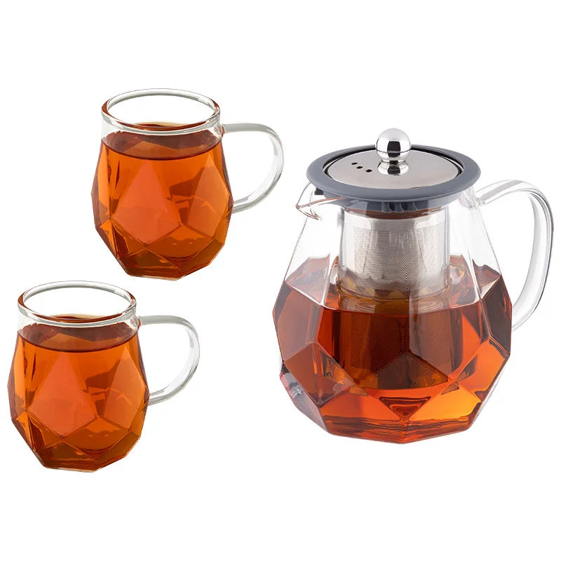 Набор из 3 предметов AROMA: чайник заварочный 820 мл +2 кружки по 250 мл из боросиликатного стекла (с гранями, из боросиликатного стекла) Упаковка: цветная коробка + пуз пленка + белая бумага.