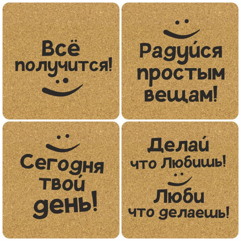 Набор из 4 подставок под кружку, пробка с рисунком, размер: 9,5 см*0,5 см Материал: пробка. Толщина: 5 мм. Размер: 9,5*0,5 см. Термоусадка с ч/б стикером 6*4 см.