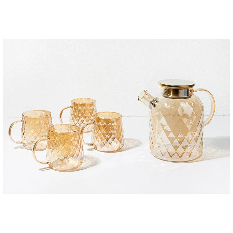 Набор из 5 предметов AROMA: кувшин 1,8 л + 4 кружки по 300 мл из рельефного цветного стекла. Фильтр-пружина из 304 нержавеющей стали. Материал: боросиликатное стекло, нержавеющая сталь, силикон. Пуз пленка/белая бумага + цв коробка.