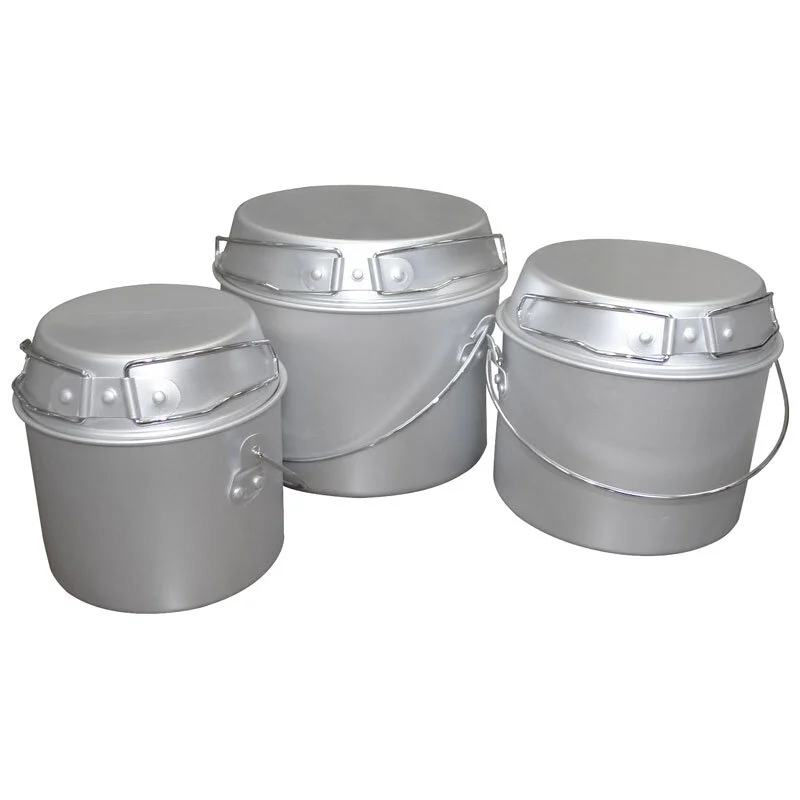 в комплект входит: * котелок 1.2 л с крышкой-сковородой Толщина стенок: 0,7 мм * котелок 1.8 л с крышкой-сковородой Толщина стенок: 0,7 мм * котелок 3 л с крышкой-сковородой Толщина стенок: 0,75 мм * чехол из нейлона Может использоваться на костре или горелке. Материал: алюминий Вес набора: ~ 700 г