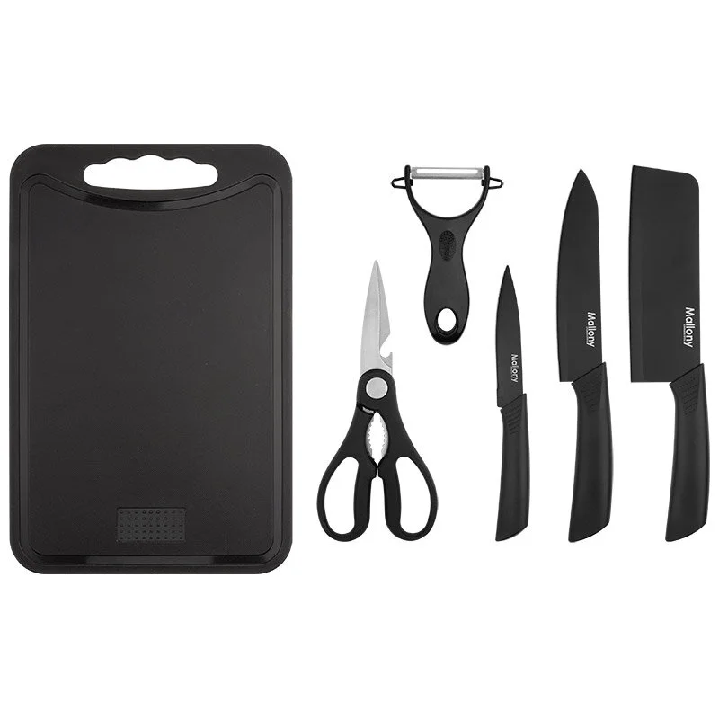 Ножи кухонные изготовлены из высококачественной нержавеющей стали, они прочны и превосходно держат заточку. Красивое однотонное покрытие лезвия препятствует налипанию продуктов. Удобная пластиковая рукоятка. Набор будет надежно служить долгие годы. Состав набора: - Топорик кухонный: длина лезвия 15,5 см, толщина стали 1,3 мм. - Нож поварской: длина лезвия 15 см, толщина стали 1,3 мм. - Нож для овощей: длина лезвия 9,5 см, толщина стали 1 мм. - Ножницы: длина лезвий 7 см, толщина стали 1 мм. - Овощечистка: 12,5*8 см. - Доска разделочная: 32,5*21,6 см. - Подставка для хранения набора: 26*10,2 см. Материал: нержавеющая сталь, полипропилен.