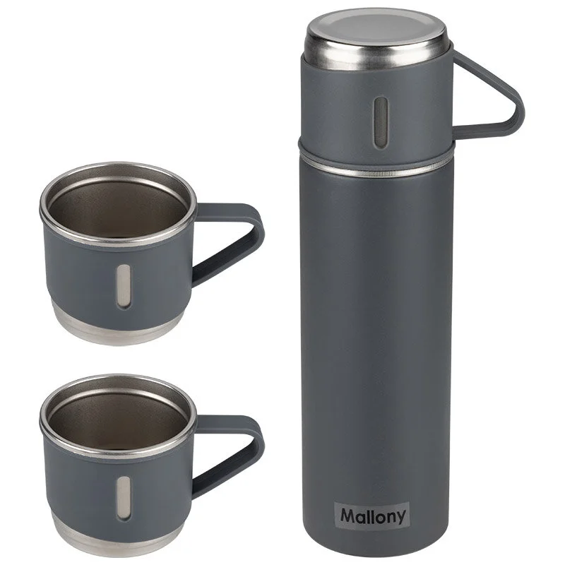 Набор термос + 3 термокружки из нержавеющей стали. Благодаря специальному покрытию его удобно и приятно держать в руке. Упакован в подарочную коробку. Объем термоса: 500 мл Материал: нержавеющая сталь (304), резина, пластмасса Цвет: серый
