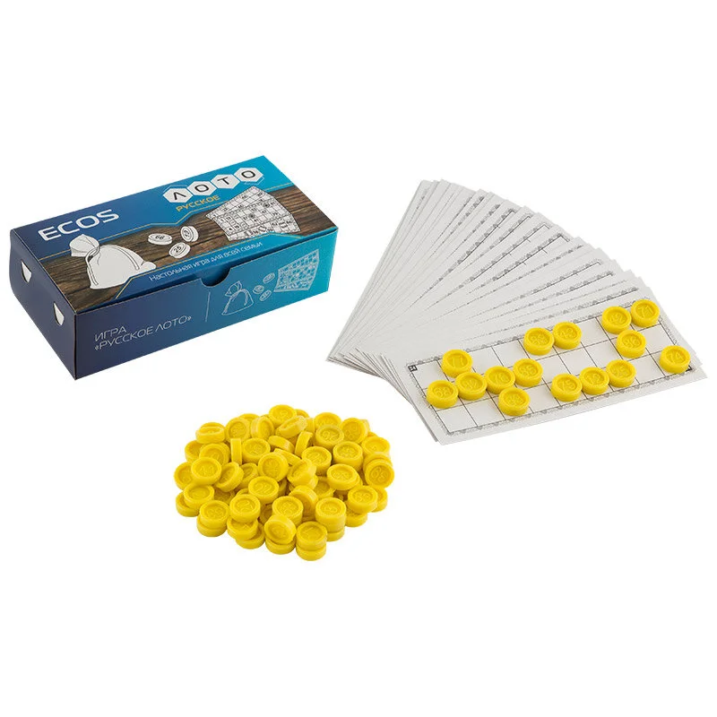 Компактная версия классического русского лото. В этой игре вместо деревянных бочонков с числами, используются плоские пластмассовые фишки. За счет чего игра занимает гораздо меньше места. Благодаря компактному размеру, эту игру удобно брать с собой в поездки или в гости. Игра универсальная, в нее с азартом играют и дети и взрослые. Большой плюс Русского лото еще и в том, что в него интересно играть и вдвоем, и большой компанией. Состав игры: - Фишки - 90 шт - карточки - 24 шт - мешочек - 1 шт Упаковка: картонная коробка 18х9х5 см + термоусадка Материал: полипропилен, картон, краска.