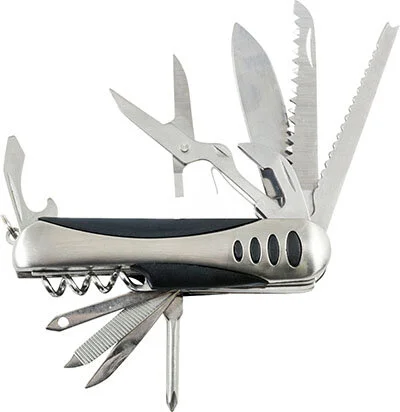 Нож многофункциональный, двойной блистер, нейлоновый чехол. Материал: нержавеющая сталь 2cr13, в раскрытом виде 15,5 см, в закрытом виде 9 см Функции: 1. нож, 2. пила, 3. рыбный нож, 4. ножницы, 5. консервный нож, 6/7. отвертка шлицевая/открывалка для бутылок, 8. отвертка крестовая, 9. шило, 10. надфиль, 11. игла для кожи, 12. штопор