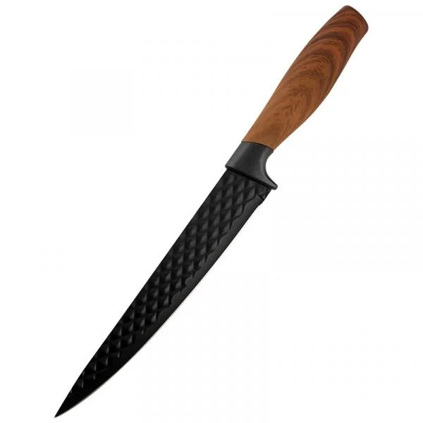 Нож разделочный Длина лезвия: 20 см. Толщина стали: 1,5 мм. Пластиковая рукоятка "под дерево" с покрытием софт-тач. Фактурное лезвие с покрытием non-stick. Материал: нержавеющая сталь 2CR14, полипропилен.