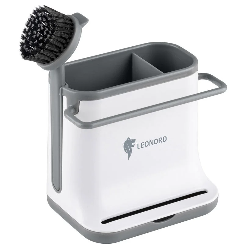 Органайзер предназначен для хранения кухонных аксессуаров, щетки, тряпки и пр. Щетка, входящая в состав набора, удобно крепится на корпусе органайзера. Два отделения позволяют аккуратно и компактно разместить все необходимые предметы. Благодаря съемному поддону влага не будет скапливаться в отделениях органайзера, кухонные принадлежности всегда будут сухими и чистыми. Размер органайзера: 14*10,8*13 см Размер щетки: 16,5*6*4 см Материал: АБС пластмасса, полипропилен, нейлон