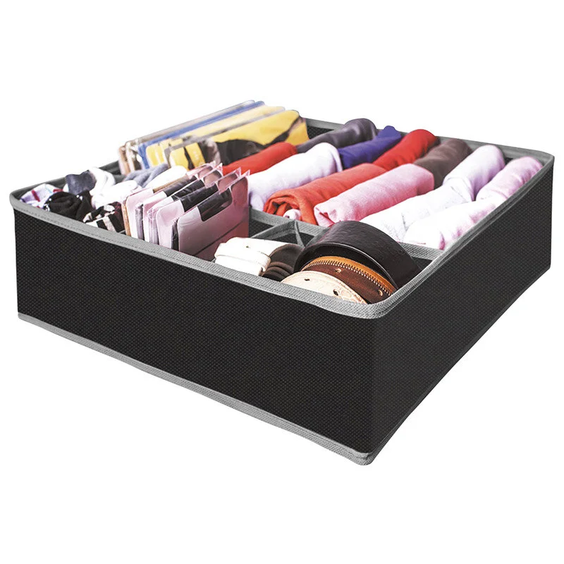Материал: Спанбонд 70 г/м2 Размер: 40х40х13 Индивидуальная упаковка: п/э пакет с подвесом Цвет: черный с серым кантом Особенности: - Жесткие стенки; - 5 отделений; - Декорированы цветным кантом; - Очень компактны; - в дно вшита молния