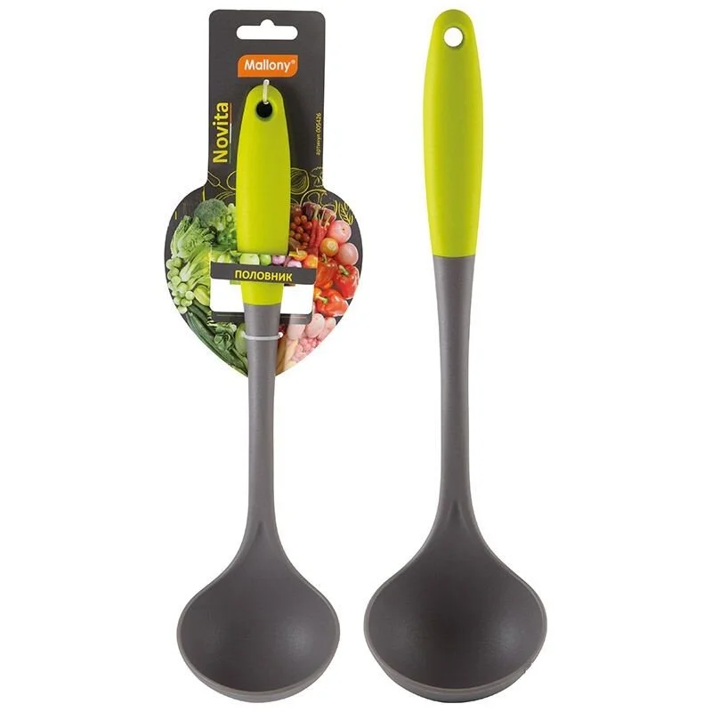 Половник из нейлона с цветной ручкой из TPR, серия Novita, тм Mallony Цвет ручки - зеленый, цвет рабочей части - серый. Материалы: нейлон, TPR Размер: 33,5*9*7,2 см Упаковка: цветная подложка. Предназначена для использования во время приготовления жидких блюд.