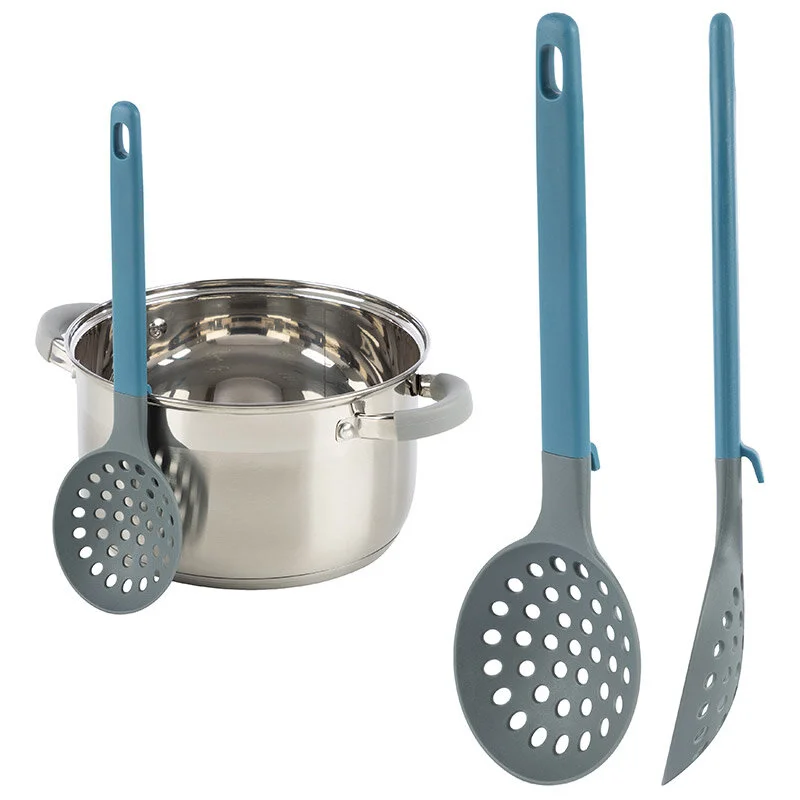 Шумовка из нейлона с ручкой из полипропилена Рабочая часть из нейлона, ручка из полипропилена, размер: 31,8*9,8*3,7 см. Цветная картонная подложка. *На ручке расположена подставка для удобства использования в горизонтальной и вертикальной плоскости. В горизонтальной - не пачкает рабочую поверхность, в вертикальной - удобство хранения после/во время использования. Температурный режим: от -20 до +210