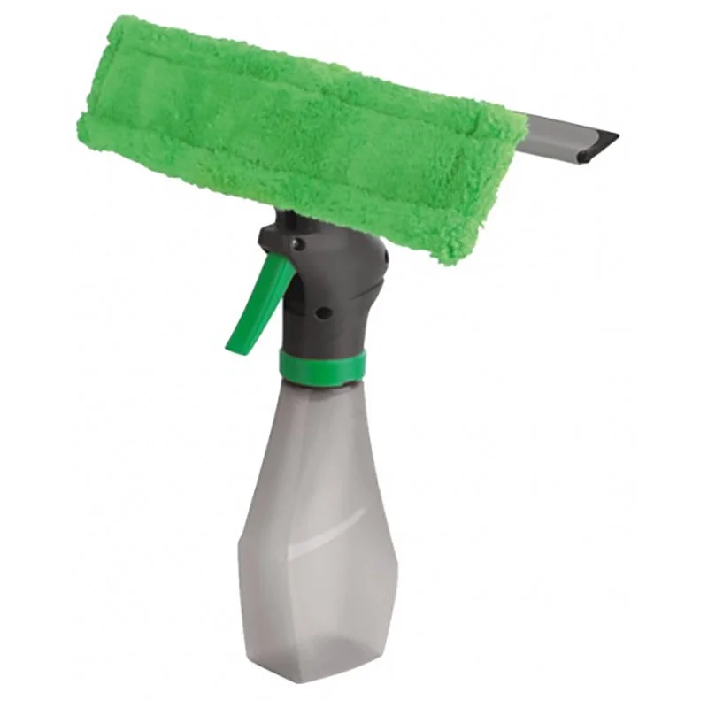 Стекломой с распылителем и емкостью для моющего средства, с насадкой из микрофибры. Размеры: 25*26 см скребок - 25,5*2 см насадка - 25*7 см Материалы: полипропилен, микрофибра (100% полиэстер), резина, алюминий Упаковка: пакет , стикер