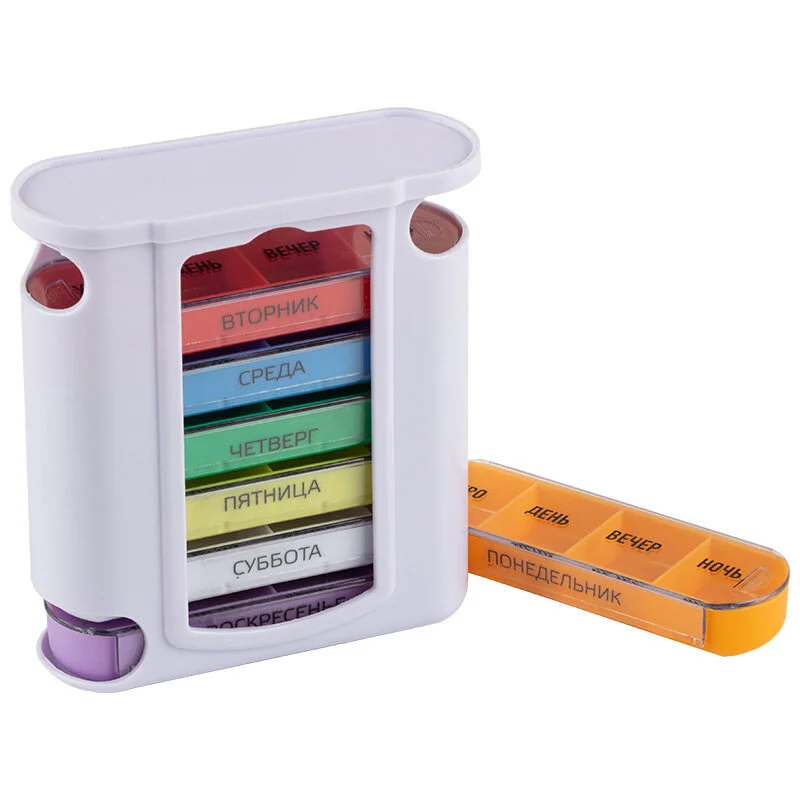Органайзер на 7 дней 7 отдельных секций на 4 приема: утро, день, вечер, ночь Размер: 10,5х4,3х12,6 см Материал: полипропилен , АБС Упаковка: пакет , стикер Предназначена для упорядоченного и компактного хранения лекарственных средств и витаминов Содержит 7 отдельных контейнеров, которые соответствуют дням недели. Каждый контейнер состоит из 4 отделений для распределения лекарств в соответствии с суточным режимом приема: утро, день, вечер и ночь.