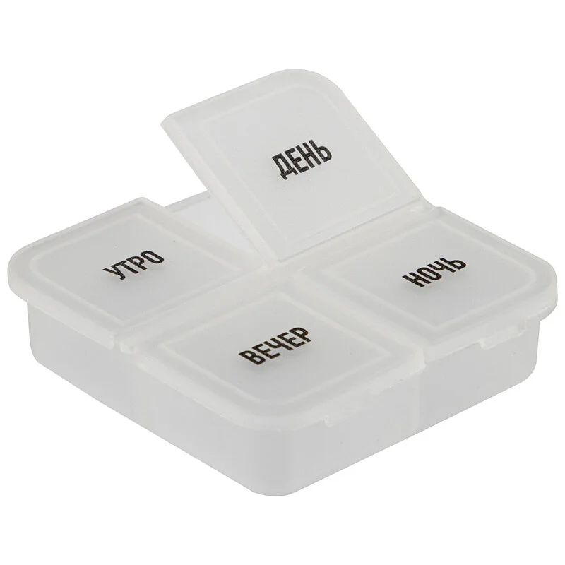 На день: утро, день, вечер, ночь Размер: 6x6x1,7 см Материал: полипропилен Цвет: прозрачный Упаковка: пакет , стикер Предназначена для упорядоченного и компактного хранения лекарственных средств и витаминов
