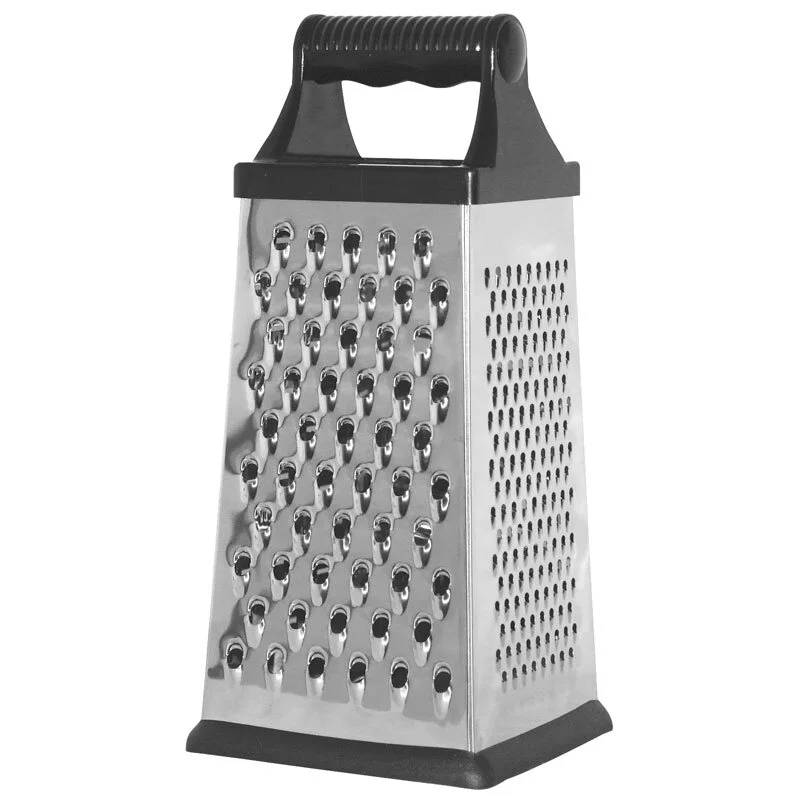 Терка 4-х гранная с прорезиненным основанием Рукоятка: ABS пластик. Размер: 12,5*11,5*26,5 см. Материал: нержавеющая сталь (430), АБС пластмасса, ТПР Толщина стали 0,3 мм