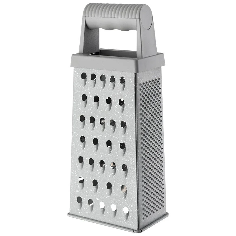 Терка четырехгранная с пластиковой рукояткой Окраска стали: серый мрамор. Рукоятка с покрытием софт-тач. Размер: 9,2*6,5*22 см. Толщина стали: 0,24 мм. Материал: нержавеющая сталь (430), полистирол.