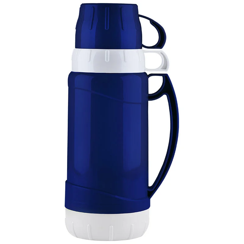 Термос в пластиковом корпусе Объем 1800 мл. Стеклянная колба с двойными стенками. 2 чашки в комплекте. Ширина горлышка 3,5 см Материал: пластмасса, стекло, силикон Цвет: синий Упаковка - картонная коробка с ячейками, стикер, пакет.