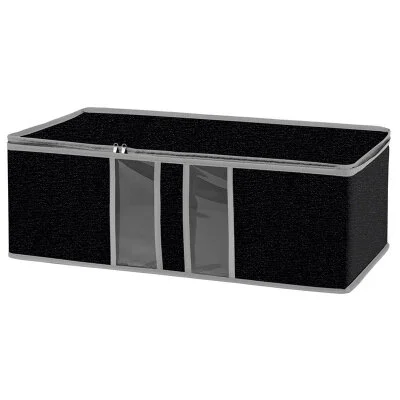Материал/состав: спанбонд, плотность 70гр/квм, двусторонняя молния, пленка ПВХ, картон; Размер: 60х30х20см; Индивидуальная упаковка: п/э пакет с европодвесом и цветным вкладышем; Цвет: черный с серым кантом Твердые стенки и дно. Предохраняет Ваши вещи от загрязнения и преждевременного старения. Закрывается крышкой на двустор молнии, прозрачное окошко в передней стенке, удобная ручка.