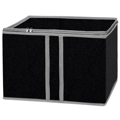 Материал/состав: спанбонд, плотность 70гр/квм, двусторонняя молния, пленка ПВХ, картон; Размер: 60х30х20см; Индивидуальная упаковка: п/э пакет с европодвесом и цветным вкладышем; Цвет: черный с серым кантом Твердые стенки и дно. Предохраняет Ваши вещи от загрязнения и преждевременного старения. Закрывается крышкой на двустор молнии, окошко для записей в передней стенке, удобная ручка.