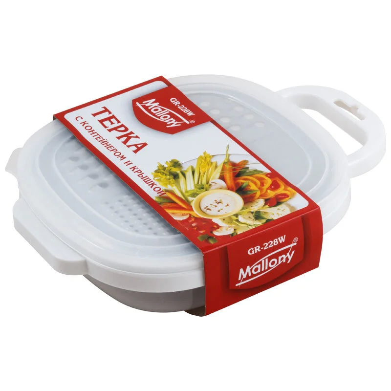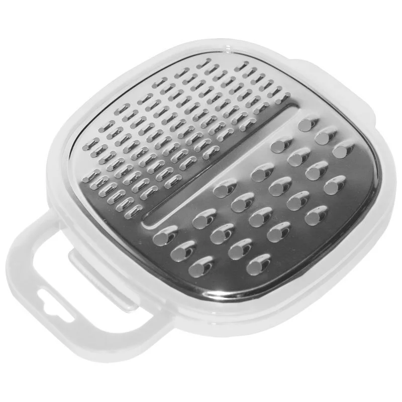 Терка с контейнером и крышкой Материал: нержавеющая сталь (430), полистирол, полипропилен. Размер: 24,5*19*6 см. Цвет корпуса терки: белый. Объем контейнера: 2 л. Толщина стали 0,25 мм.