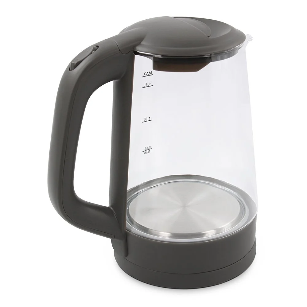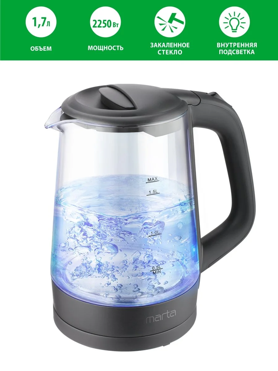 Современный, легкий и прочный чайник в элегантном корпусе из закаленного термостойкого стекла с голубой внутренней подсветкой и закрытым стальным нагревательным элементом сохраняет природный вкус и натуральные свойства воды, препятствует образованию накипи. Стеклянный чайник очень легок и при этом обладает высочайшей прочностью.