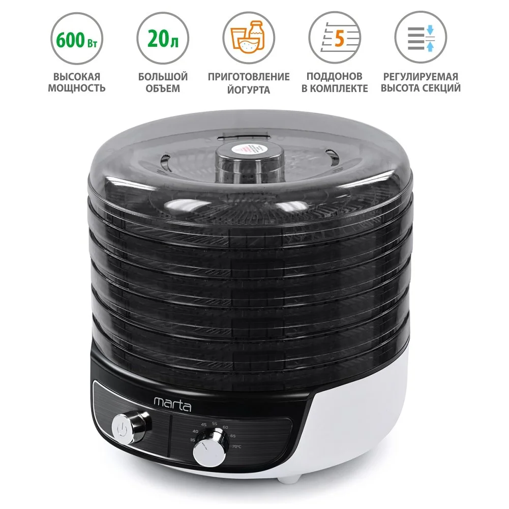 Мощность 600 ВТ позволяет эффективно и быстро сушить большой объем продуктов.