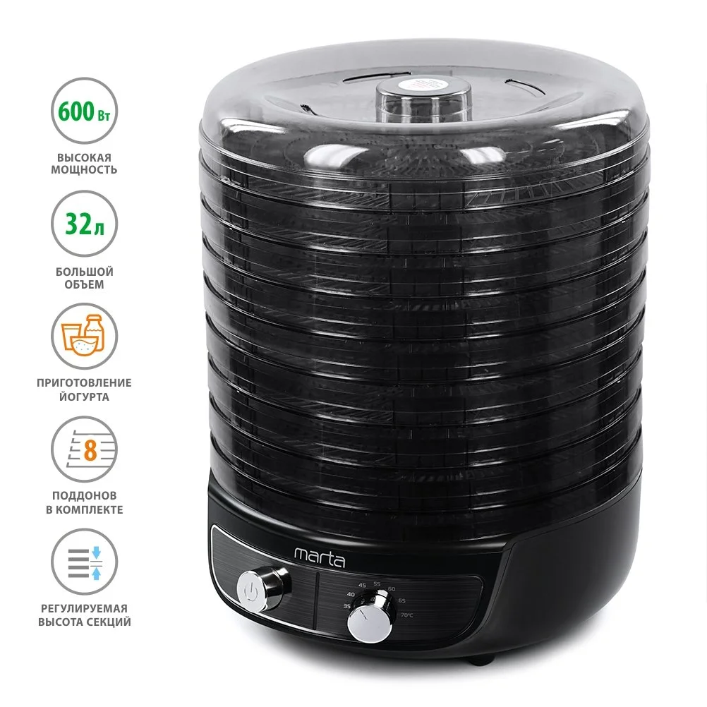 Мощность 600 ВТ позволяет эффективно и быстро сушить большой объем продуктов.