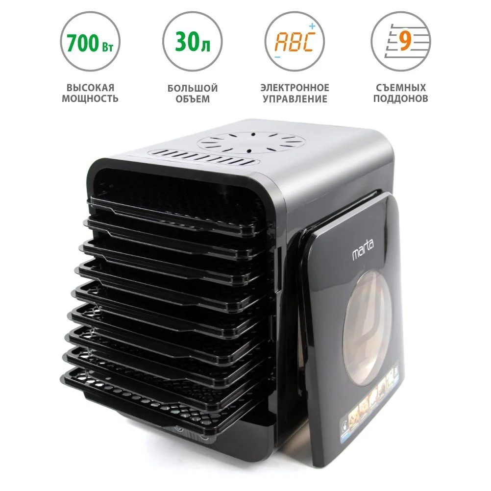 Мощность 700 ВТ позволяет эффективно и быстро сушить большой объем продуктов.