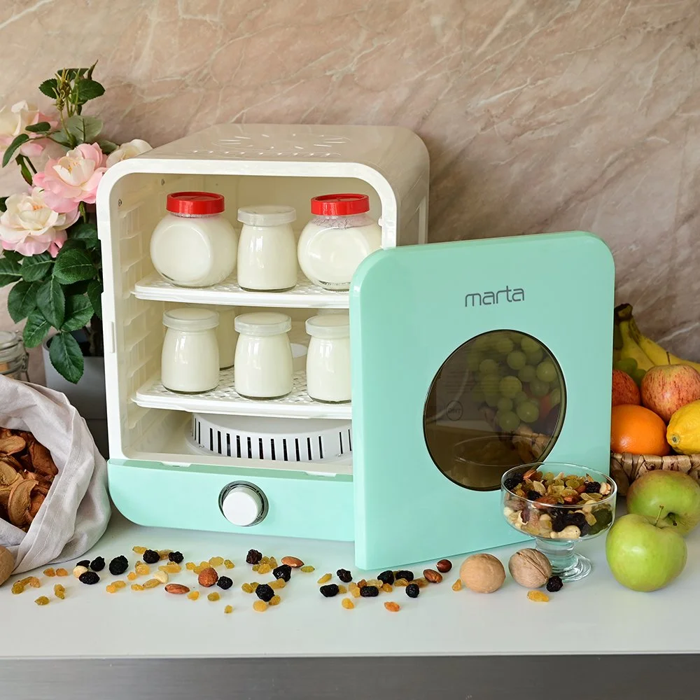 ЙогуртницаИнновационная конструкция позволяет расширить функциональные возможности сушилки и превратить ее в настоящую йогуртницу. Совокупная возможность установить необходимый температурный режим и наличие общей рабочей камеры позволяет получить качественный кисломолочный продукт в домашних условиях, без применения дополнительных приборов. Теперь в сушилке можно приготовить такие продукты как: